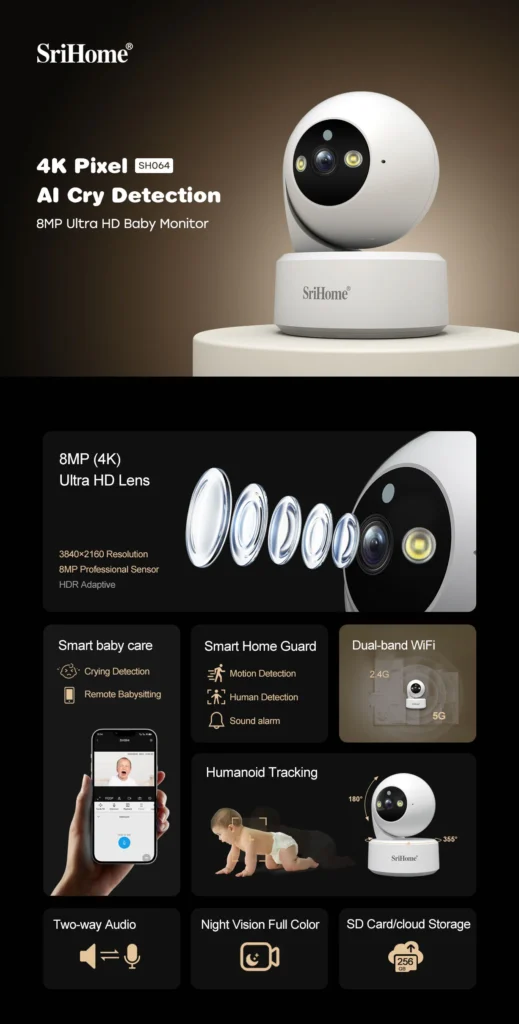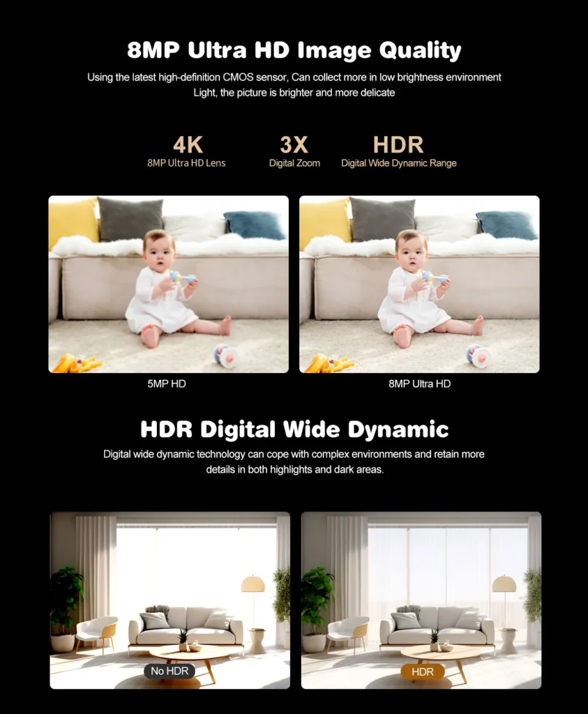دوربین بیبی کم سری هوم مدل SH064 با ارائه وضوح UHD 8MP (3840×2160P)، تصاویری با جزئیات باورنکردنی ثبت میکند. این وضوح بالا، در کنار استفاده از کدک فشردهسازی H.265، تضمین میکند که ویدیوهای شما کمترین حجم ممکن را داشته باشند، بدون آنکه از کیفیت اصلی کاسته شود. این ترکیب فنی، فضای ذخیرهسازی و پهنای باند مصرفی شما را به شکل چشمگیری بهینه میسازد.
