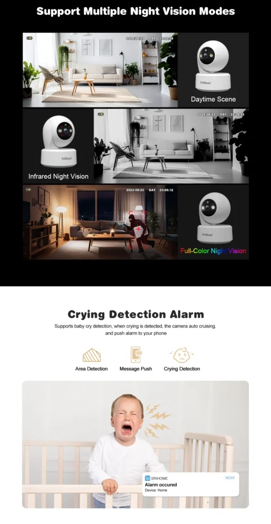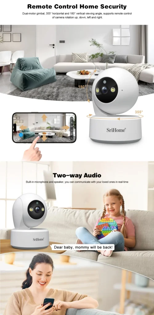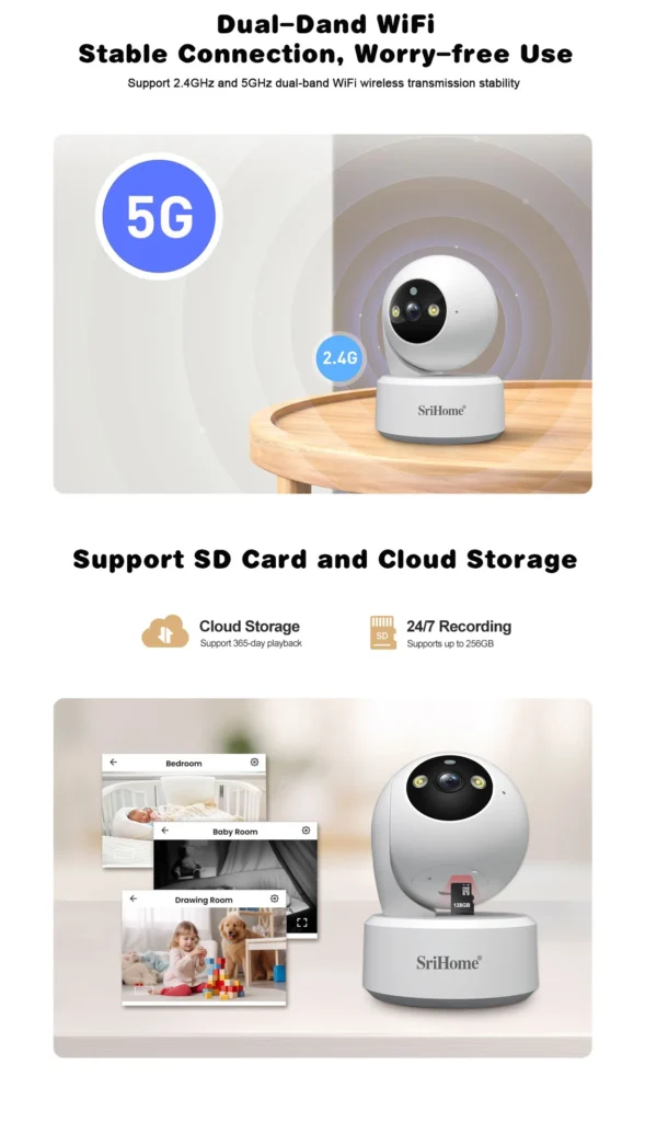 اطلاعات شما با پشتیبانی از کارت حافظه تا 256 گیگابایت ذخیره میشود، که برای ضبط مستمر کافی است. سیستم هشدار هوشمند آن شامل تشخیص حضور انسان و تشخیص گریه است و هشدارهای دقیق را به گوشی شما (از طریق اپلیکیشن SriHome) ارسال میکند. همچنین، امنیت دادهها با تعیین مدیر اصلی و امکان تعریف چهار ناحیه حریم خصوصی (Privacy Block) کاملاً تضمین شده است.