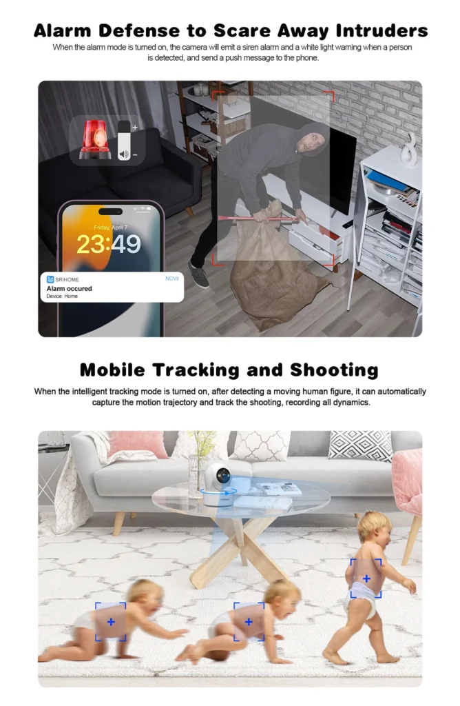 با قابلیت چرخش گسترده Pan 355° و Tilt 180°، میتوانید کل فضای اتاق را با کنترل از راه دور پوشش دهید. علاوه بر این، فناوری تشخیص و ردیابی حرکت انسان به دوربین این امکان را میدهد که به صورت خودکار سوژه متحرک را دنبال کند و با بزرگنمایی دیجیتال 3 برابری، جزئیات بیشتری را در اختیار شما قرار دهد.